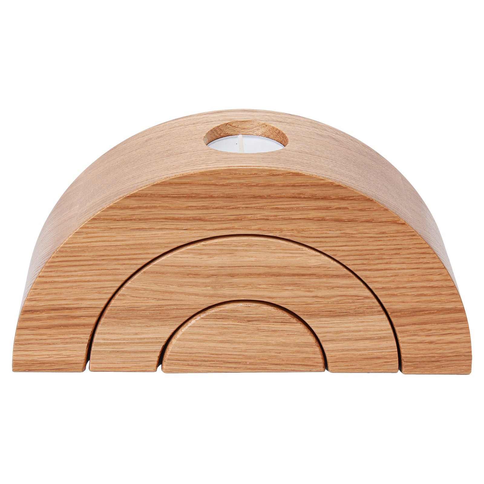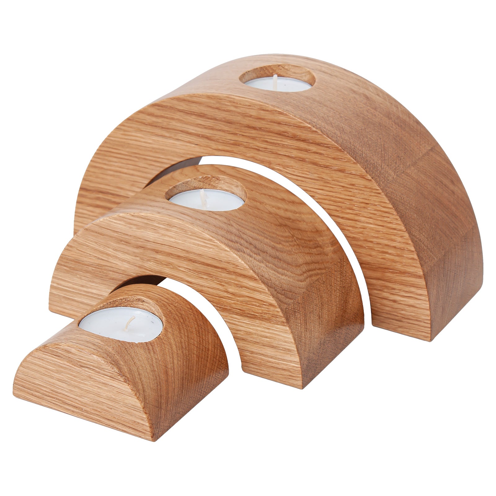 Minimalistisk sæt af trælysestager med en naturlig oliebehandling. Designet til at bringe varme og materiel tilstedeværelse til bordet uden pynt.